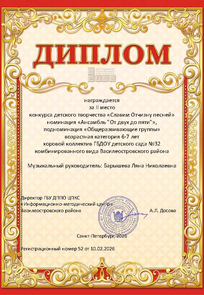 - 2026 год - Диплом за II место конкурса детского творчества «Славим Отчизну песней», номинация «Ансамбль "От двух до пяти"», подноминация «Общеразвивающие группы» возрастная категория 6-7 лет. Хоровой коллектив ГБДОУ 32.